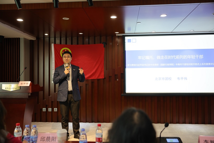 讲座由北京市团校副校长韦平伟以“牢记嘱托,做走在时代前列的年轻干部——深入学习领会习近平总书记在中央党校中青年干部培训班系列重要讲话精神”为主题为青年们作精彩授课,从“为什么、干什么、怎么办”三个方面,论述如何做走在时代前列的年轻干部,帮助青年干部对标新时代年轻干部的要求,进一步夯实健康成长的根基。